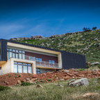 Exterior detail of sun screening,second floor deck and outdoor fireplace. – Modern – Exterior