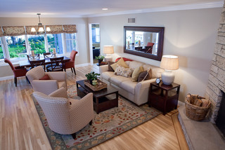 We have a similar setup to this with a corner fireplace and our large dining room table at the