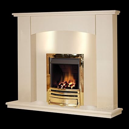 Cream Stone Marble Curved Modern Wall Surround Gas Fireplace Suite Brass Inset Gas Fire with