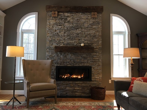 New Nantucket Stacked Stone and Reclaimed Oak Timber Fireplace