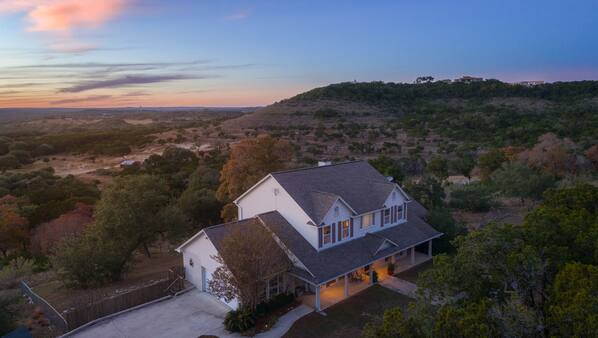 Stunning Hilltop Sunset View, 5 Private Acres, Walk to Blue Hole Trail! in New Braunfels, TX