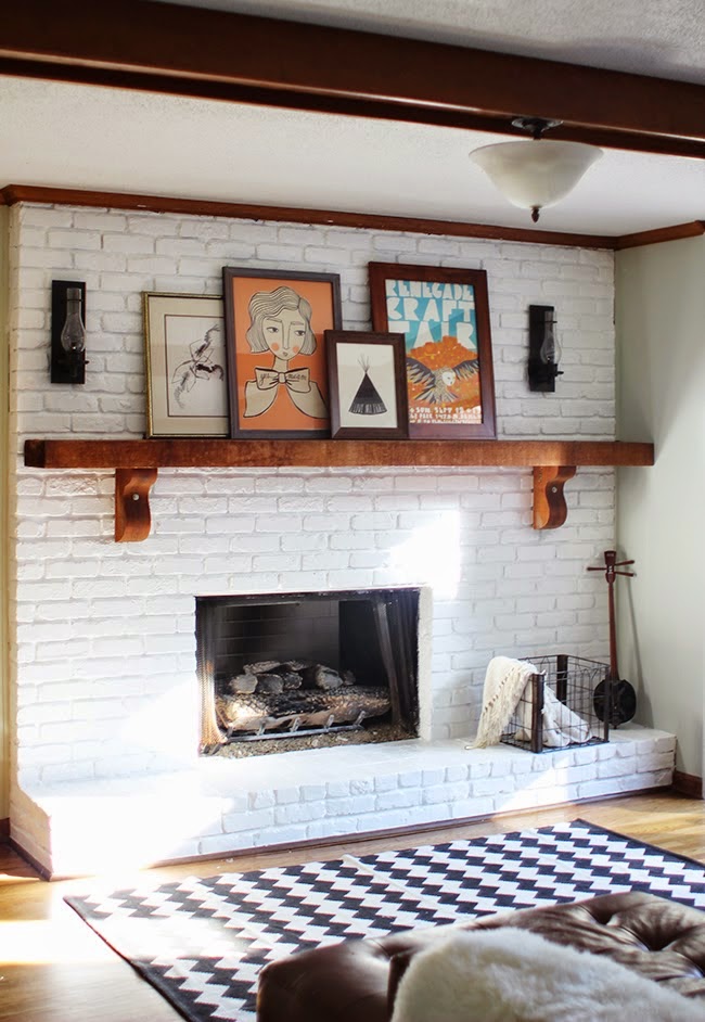 Love the white brick. We want a mantle with a brown reclaimed wood to coordinate with floor co